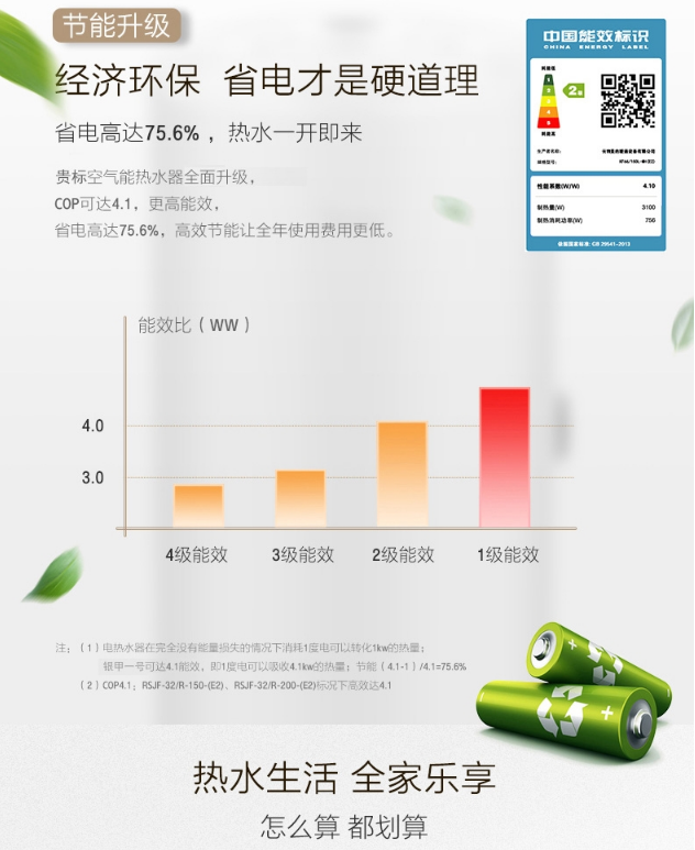 因?yàn)闊岜梦窄h(huán)境中三份的熱量加上自身壓縮機(jī)作功產(chǎn)生的一份熱量,所以其耗電量只有等量電熱水器的四分之一,即相當(dāng)于使用同樣多的熱水??諝饽軣崴鞯臒嵝矢哌_(dá)300%-500%,比一般的熱水器高4-5倍,所以它制熱水的成本就很低,也就省電。空氣能熱水器每天的電費(fèi)在1-2元錢,與一般熱水器相比,每月可節(jié)省電費(fèi)費(fèi)用約70-80%。